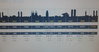 Empiezo a notar que me cuesta ir con las liebres, si bien aguanto. Se me ha despegado el imperdible de arriba del dorsal, casualidad. Me tomo un gel. Opto por ir más cómodo y seguir la estela. Pierdo comba, pero me mantengo a unos 50 metros. Paso el 30 en 02:18. Así voy bien, si bien noto que el “muro” ha llegado (En Donostia lo noté a partir del 23, con lo cual hemos mejorado). Si bien no voy ya con el grupo, es curioso ver que aún así voy pasando a bastante gente. De hecho, en la información de carrera veo que pasé de ser el 2771 a la salida, a acabar el 1832, con lo cual he mejorado 939 puestos.